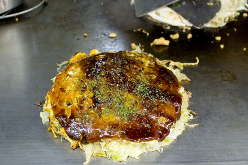 The okonomiyaki here is well constructed, with distinct layers of egg (a bit thicker than average), noodles, bacon and other fillings, then a good volume of cabbage on top of a sturdy, chewy base. Budget around Y1000-1500 for food.