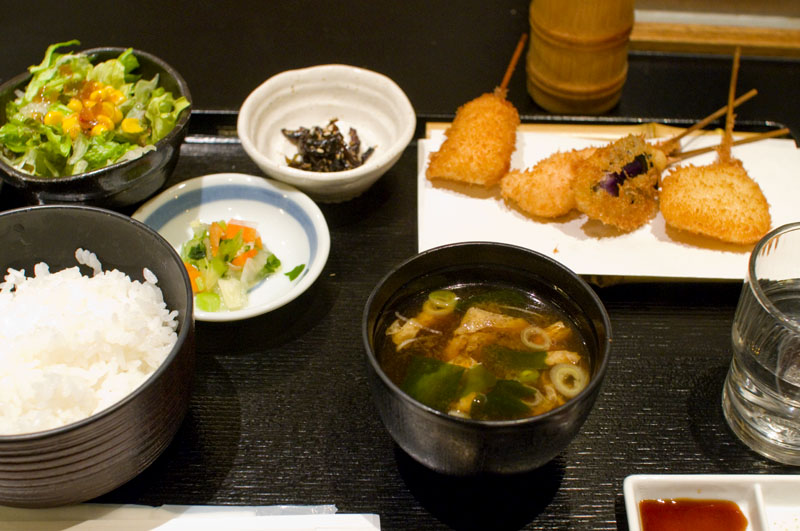 Top-quality seafood, meats and vegetables go into the kushiage here, and while the average dinnertime budget is around Y6000, lunch is a real bargain at just Y1000. The set lunch features eight assorted deep-fried skewers, and since it's the only thing on the menu you can just take a seat at the counter and wait for your freshly prepared skewers to arrive, one by one, on your plate.