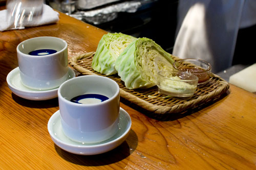 The initial round comes with a helping of crunchy raw cabbage on the side along with two excellent sauces to dip it in - a garlic-heavy spicy pepper dip and a pungent wasabi dip. Their bowl of assorted oden (Y1200) is highly recommended as a side dish, and is big enough for two to share. Drink options include five or six craft sake, most on the karakuchi end of the scale and all chosen to stand up well to fried foods.