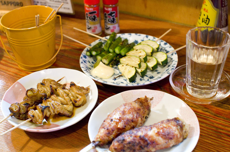 Balance your meal with excellent grilled zucchini, asparagus and other vegetables, or with the seasonal vegetable plate served bagna cauda style. The motsu nikomi (organ-meat stew) is also quite hearty and satisfying, and goes very well with the more assertive sakes on the list. The setting is a very unpretentious izakaya-style pub, built around a long counter with a few small tables in back. Budget around Y2000-2500 for food and drink.