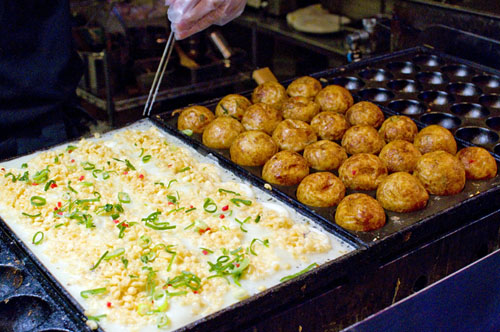 Takoyaki, kushiage and yakisoba are served Osaka-style here at this late-night, Osaka-based shop. There's a big takoyaki grill in the front take-out window, a small six-seat counter on the ground floor, and space for another twenty or so upstairs.