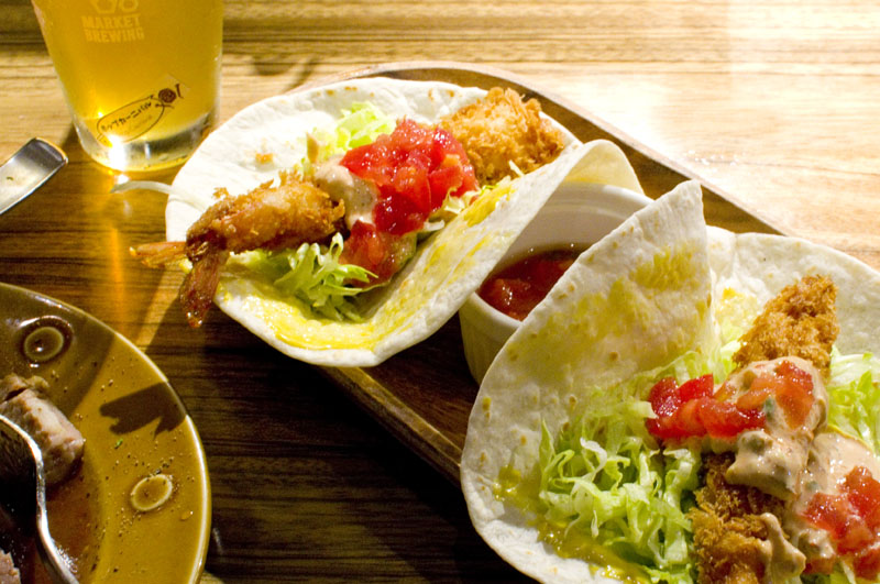 The food offerings are an entertaining mix of Nagoya specialties and American-style bar favorites, with dishes like Taiwan taco rice, teppan jambalaya and ebi-fry tacos. The latter were pretty good, made with big tasty prawns, and the kakuni (stewed pork) was nice and fatty, with a rich Nagoya-style miso base.