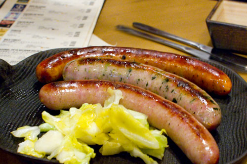 Yona Yona's beer-friendly food menu is well put together; in fact we'd probably recommend this restaurant even for non-beer drinkers. Fifteen types of specialty sausages are a main draw, with spicy varieties (yuzu-kosho, chorizo, squid-ink, curry), unusual meats (venison, pork organ meats), and intriguingly offbeat combinations (spinach-lotus root, squid-scallop-milt).