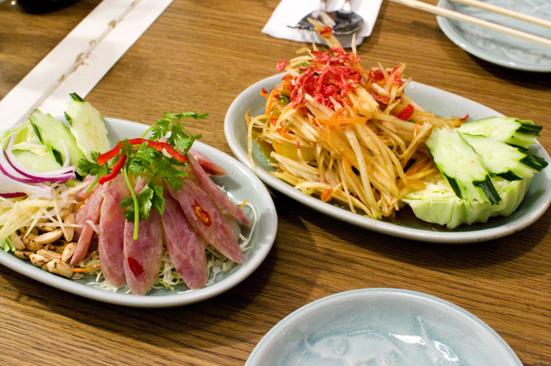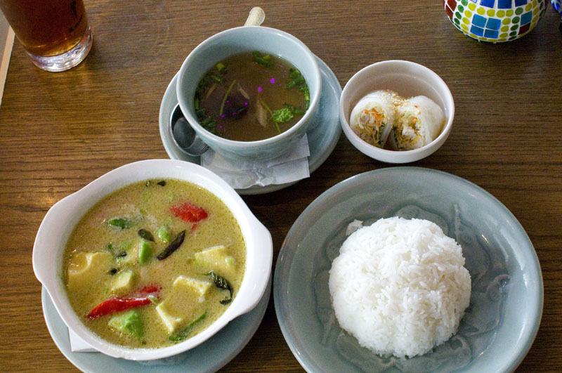 The kitchen here isn't shy about robust flavors - our stir-fried water spinach was very, very garlicky, as were the plump prawns. Spicy papaya salad was very spicy, and sour soup was properly sour. Spring rolls were fresh-tasting, and our green curry was full of rich, ripe avocado balancing the tasty shrimp.