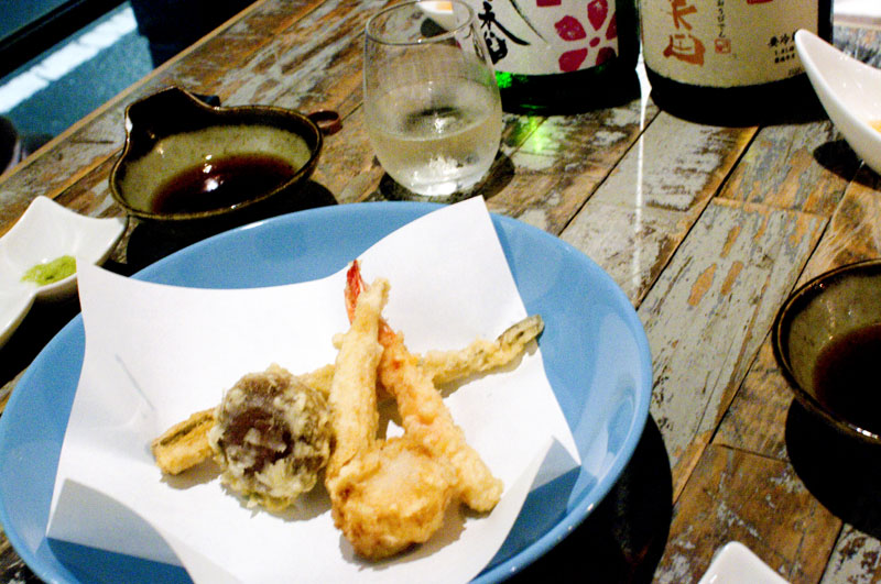 The food menu focuses on tempura, a dish more often found in brightly lit traditional counter shops rather than more casual settings like this. Basic skewers such as prawns, anago eel and vegetables are priced at Y150-200, supplemented by more deluxe, original items like coriander prawn kakiage. The breading is light, and the fresh, clean flavors of the ingredients come shining through.