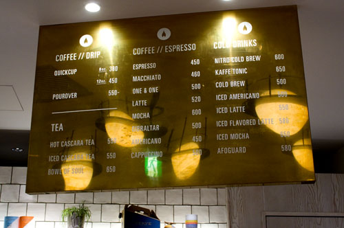 Caffienated beverages here come in a bewildering variety of styles, with regular pourover and "quickcup" drip coffee, two kinds of cold-brew iced coffee (regular and "nitrocold brew"), and espresso variations including Gibraltar and "one and one" (a split shot served as both espresso and macchiato). You can choose your favorite beans, of course, or if you're indecisive you can try a tasting flight of three different coffees (Y980).