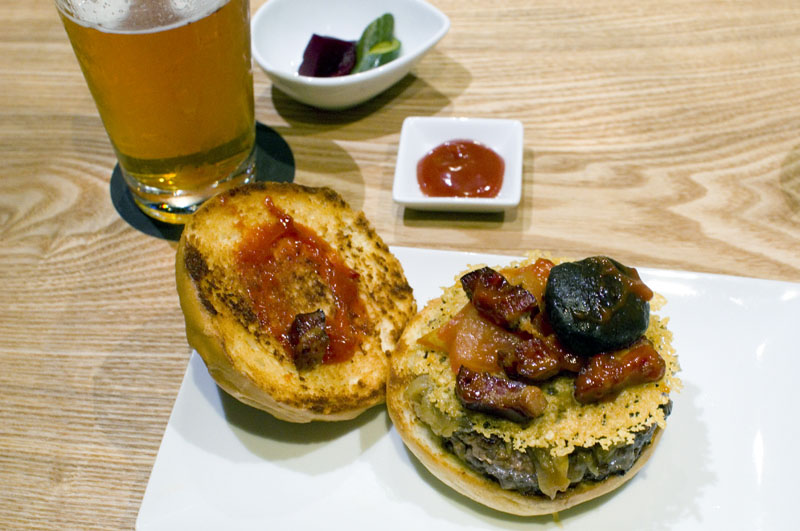 The kitchen turns out a dozen different beef-based burgers, variously featuring components like wasabi aioli, fried lotus root and cabbage (the Teriyaki Burger); kimchee and coriander (the K-BBQ burger); apple wood-smoked bacon and onion strings (the Manly Chick Burger); and truffle aioli, truffle cheese and truffle glaze (the Truffle Burger). There are numerous optional toppings, including two different kinds of bacon. The falafel burger and fish-curry burger serve as non-beef options.