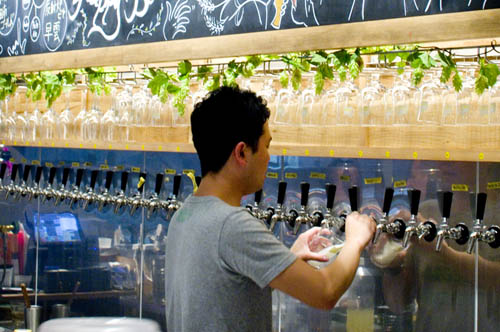 The dining room is similar to other CBM branches - loud and energetic, with most seating at high tables and a couple of counter areas. We found the stools at the counter to be more uncomfortable than average, but on the other hand table seating seems to be more spacious and less cramped than at other downtown branches. Service is friendly and efficient. Prices for the thirty beers on tap are the same as at other branches - US pints are just Y900 and glasses Y600, with a Y300 table charge.