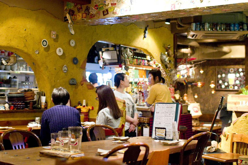 Beers come in three sizes (200ml, 350ml and 580ml) and are quite reasonably priced at Y490, Y750 and Y990 respectively. The entertaining food menu is wide in range - tandoori chicken (topped with a poached egg), Thai sausages, Vietnamese spring rolls, mini-pizzas - but generally takes a back seat to the beer. Budget around Y3500 for dinner with drinks.