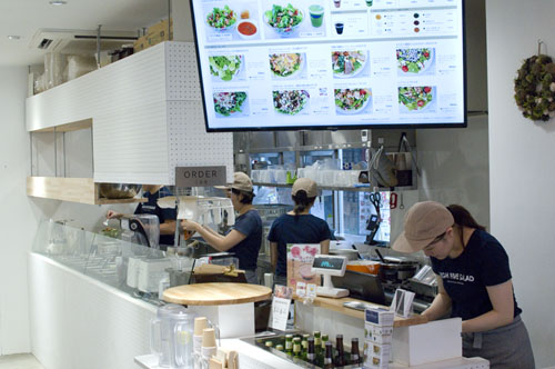 Various dressings and toppings liven things up, and you can add squiggly pasta to your salad for free. There are eight salads in all, priced Y880-1100. Drinks include smoothies and iced coffee.