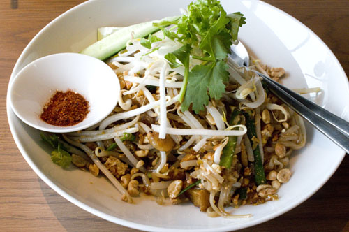 The Pad Thai main dish, which we ordered on our waiter's recommendation, was perhaps the least interesting Pad Thai we've encountered in Tokyo. It didn't even have big prawns to distract from the rather mushy mass of noodles. On the other hand the portion size was huge, and probably would have been enough for both lunch and dinner had we finished eating it.