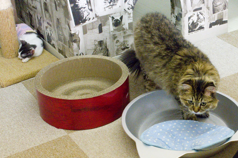 The playroom is quite spacious, with both floor seating and stools at cafe-style tables as well as plenty of climbing trees, shelves and perches for the residents. There's a free vending machine for coffee and other soft drinks - just help yourself - and bouncy bebop jazz plays in the background. The staff seem to be more proactive than average.