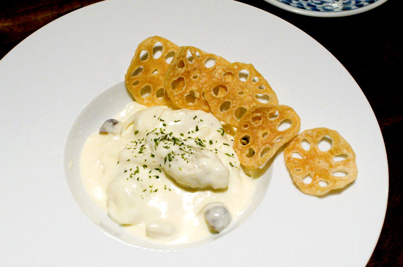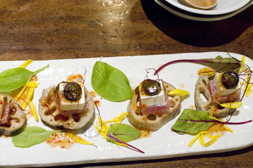Ground lotus root serves as a flavorful substitute for potatoes in dishes like renkon hash-browns and renkon gnocchi with gorgonzola sauce. Taking advantage of their sturdy structural qualities, thick lotus root slices are used to form the base of Italian-style canapes with proscuitto and olives - an inspired combination. There are also more traditional dishes like classic Kyushu-style deep-fried renkon stuffed with spicy yellow mustard, chilled renkon tofu, and various renkon-seafood dumplings.