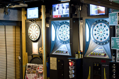The bar is big enough to have both smoking and non-smoking sections, with comfortable table seating at one end, stools at the opposite end (and at the bar), and dartboards along one wall. The bar is open until very late on Friday and Saturday nights, which is good to know in case you've missed your last train out. (Regular weeknight hours also run late, but the last order is 2am.)