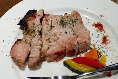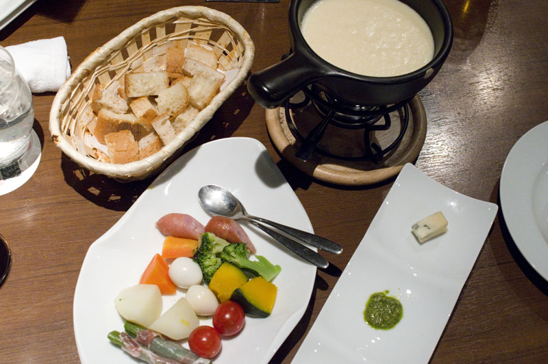 Everybody seems to start with the fondue here, so you might as well order it when you sit down. It comes with an appealing assortment of vegetable and meat tidbits for dipping, plus unlimited bread, solving the age-old fondue-restaurant problem of having to ration your bread to match your cheese consumption. You'll also get a small dish with extra seasonings like spicy tomato miso, gorgonzola and pesto, which you can add halfway through the course to liven up the cheese pot.