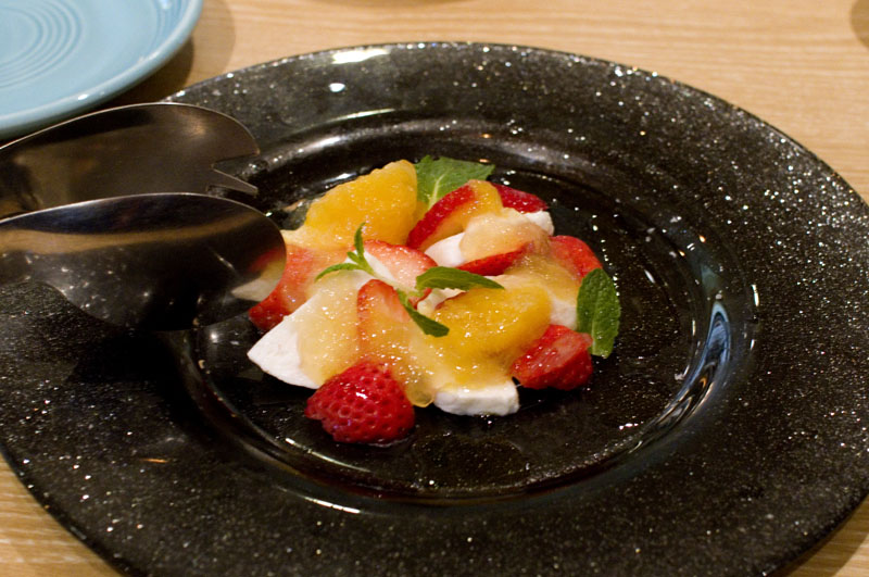 The frozen blue cheese salad is also surprisingly dense, with substantial amounts of chopped vegetables in addition to the greens. The fresh mozzarella-strawberry caprese with orange sauce is much lighter, although the sauce makes it sweeter than the usual starter. Alsatian four-cheese tarte flambee is a nice balance of sweet and savory, with a drizzling of honey complementing the savory cheese topping.