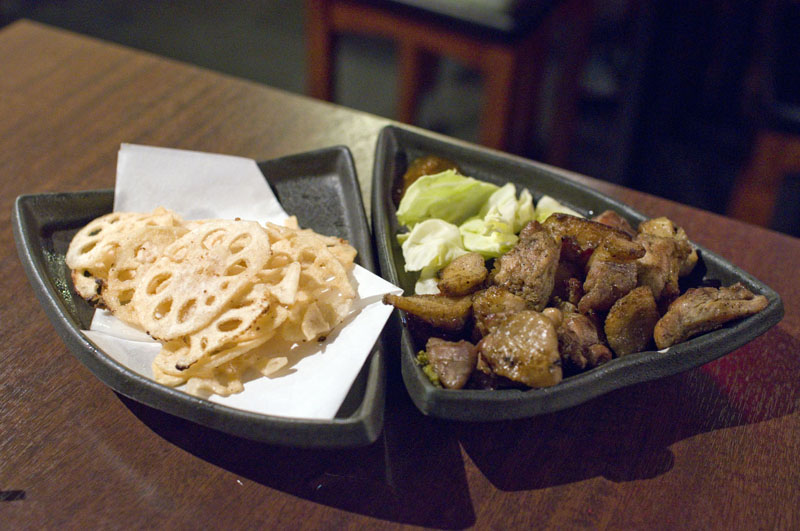 The excellent charcoal-grilled chicken is served in small chunk-size pieces on a platter (rather than on skewers), with your choice of thigh meat, neck meat, chicken skin or giblets. Yuzu-kosho, spicy miso, and not-so-spicy miso come on the side. Other chicken options include deep-fried chicken tail and chicken neck, chicken thighs grilled with garlic, chicken stir-fried with bean sprouts, and fried chicken wings. One of the more quirky options is "stick tsukune" - crunchy cylinder-shaped chicken meatballs served with a spicy mayonnaise dressing.