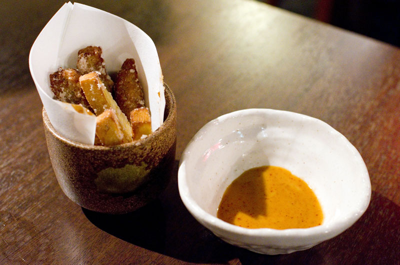 The kitchen also gets high marks for the simple but well-executed side dishes such as their deep-fried lotus-root chips and the pleasantly crunchy, rather garlicky pickled cucumbers. Sweet-potato ice cream and chocolate fondant are among the dessert options, and drinks include fresh-squeezed yuzu cocktails and soft drinks along with a few seasonal sake and shochu.