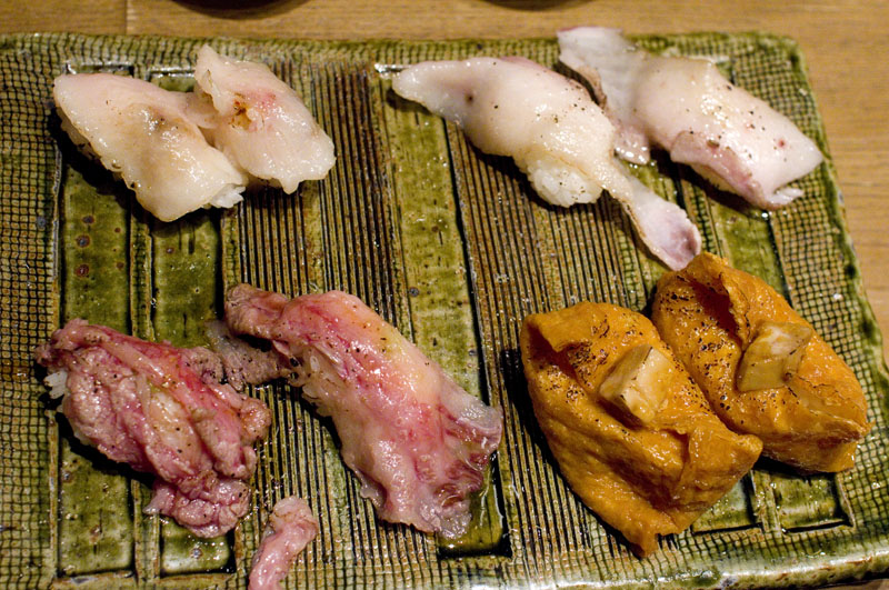 Most meaty toppings are cooked, or at least lightly seared, but they also serve sashimi-style raw chicken and horsemeat. The selection of sushi by the piece features tempting items like roast beef, beef tongue, beef with sea urchin, duck breast, foie gras, avocado-chicken salad and sukiyaki. Various assorted platters are also nicely put together, but try to order at least one platter for each person at the table so you don't have to fight over who gets which piece.
