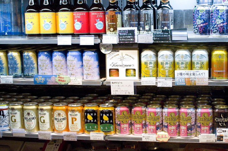 Beers from several Nagano craft brewers, including the excellent Shiga Kogen brewery, are available by the bottle or can to take home. They also sell fresh produce (including fresh wasabi root), dairy products, fruit and vegetable juices, frozen steamed pork buns, and wooden crafts and pottery made by local Nagano craftsmen.
