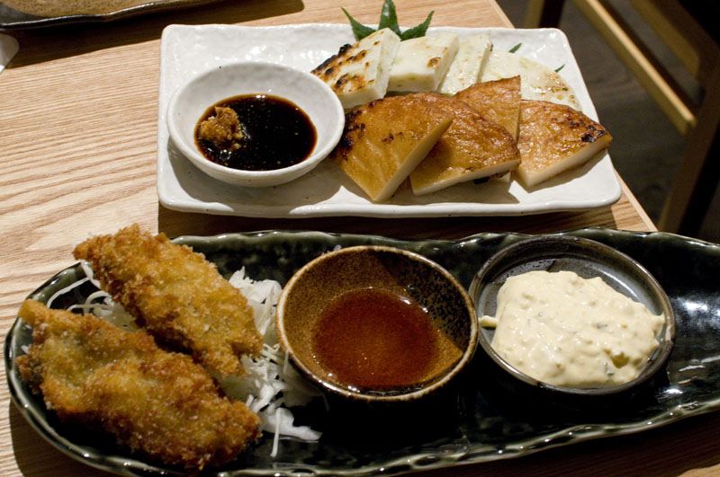 Befitting a versatile izakaya, many of the small dishes here go equally well with sake or craft beer. Some recent highlights were a platter of excellent satsuma-age fish cakes, a light-tasting potato salad, and obanzai-style eggplant and kimpira appetizers. The distinctively flavored Mie-style tsukemono pickles are very satisfying, although the bracingly tart takuan might take some getting used to.