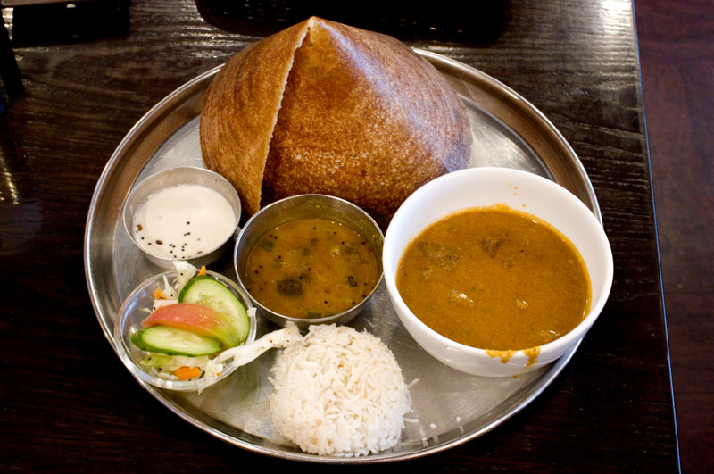 Andhra serves excellent South Indian cuisine, including a good assortment of dosas, along with a variety of tandoori dishes. Lunch specials include a dosa and curry plus several side dishes for Y1190 (pictured) and a tandoori special - three tandoori items plus curry, for Y1790. The L-shaped dining room is relatively spacious.
