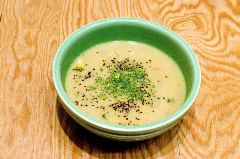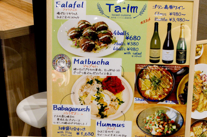 The menu expands a bit at dinnertime, with additional options like lamb and beef kebabs, shakshuka (egg and vegetable casserole), matbucha (a spicy tomato and pepper cooked salad), basmati rice dishes and traditional Middle Eastern sweets. The brightly decorated shop has a handful of tables at the back and counter seating as well. Lunches are priced from Y1080-1680, while dinner averages around Y3000-3500 for food and drink.