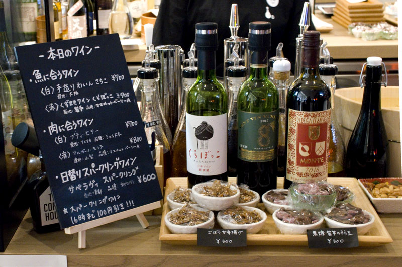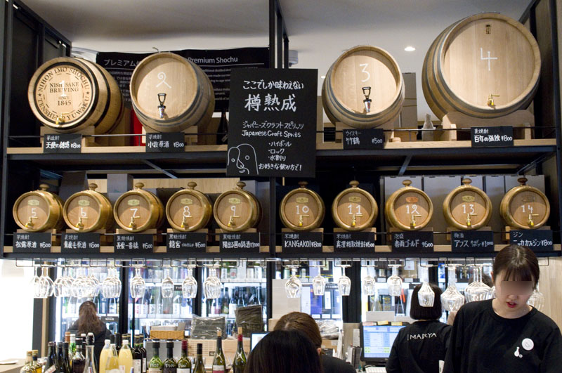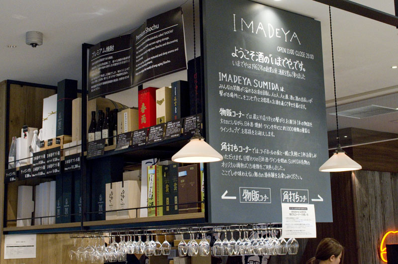 If you want something to nibble on with your drinks, Imadeya offers small otsumami-style dishes for Y300-500, or you can get a seafood donburi or an Umami Burger from one of the other shops in the food court. Sake is priced from Y450 per glass, and wine from Y600, and of course if you find something you like you can pick up a bottle or two to take home.