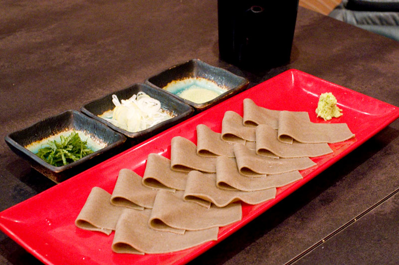 Nagi bill themselves as a sake and soba restaurant, and in addition to the typical bowls and trays of hot and cold noodles they feature an unusual "soba sashimi" - wide ribbons of freshly made buckwheat noodle served cold with a dipping sauce. You can also try dabbing the noodles in green-tea salt, which really brings out the nut-like flavor of the buckwheat.