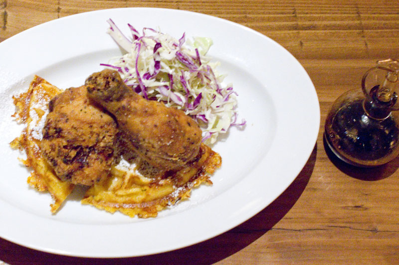 In the evening you'll find an expanded menu of creative American comfort foods like duck meatloaf and fried pork chops. There's a hefty grilled-cheese sandwich that's stuffed with apple, bacon and cheddar, offering nicely contrasting textures and tastes. Fried chicken is prepared with a thick, crunchy shell and served on fantastic buttermilk waffles - the best version of this classic dish we've had in Tokyo.