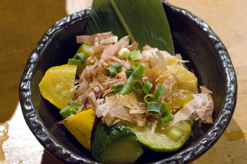 All the chicken we've tried here has been tender and very flavorful, with excellent skewers of bonjiri (tail), harami (diaphragm) and soriresu (juicy "chicken oyster" next to the thigh joint). Vinegared cabbage is a standard accompaniment to Kyushu yakitori, and the especially tasty version here comes with strips of nori and bits of ginger. Sauteed zucchini provides a refreshing break from the grill - unlike in most yakitoriya, grilling on skewers isn't the only option for vegetables here.