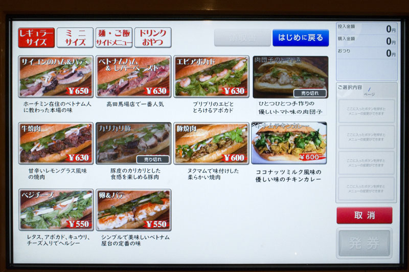 There's a vending machine ticket system, where you order via the machine but keep your ticket and wait for your number to be called. You can customize your order to the extent that you can omit or include cilantro, chili sauce, mayonnaise and butter from each sandwich. Half-size sandwiches are also available.