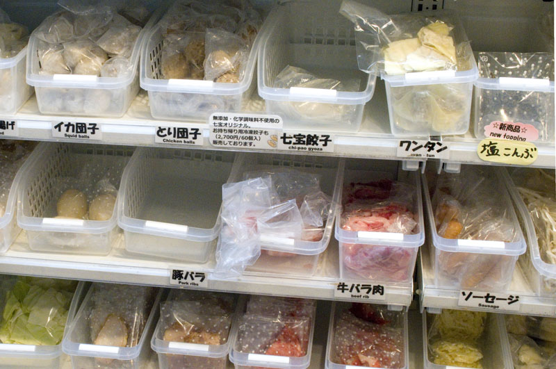 Some popular ingredient choices include dumplings stuffed with shrimp and crabmeat, leafy vegetables like spinach, bok choy and shungiku, and enticing combinations like bacon-wrapped cheese and fried tofu stuffed with ground pork. These add-on toppings come in pre-measured packets, and they're lined up in a big refrigerated cabinet at the shop's entrance.