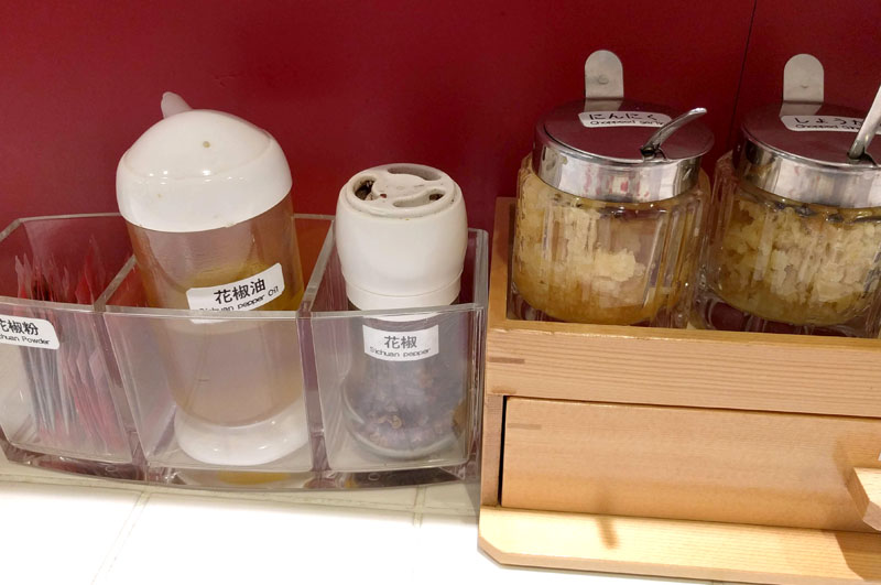 Alternatively you can start from zero and add your own condiments from the counter. These include Szechuan peppercorns fresh from the grinder, powdered Szechuan pepper, and Szechuan pepper oil as well as garlic, ginger and soy sauce. Thai-style Tom Yam seasoning is another option for your soup, but it tends to overwhelm the other flavors, so it's not really recommended.