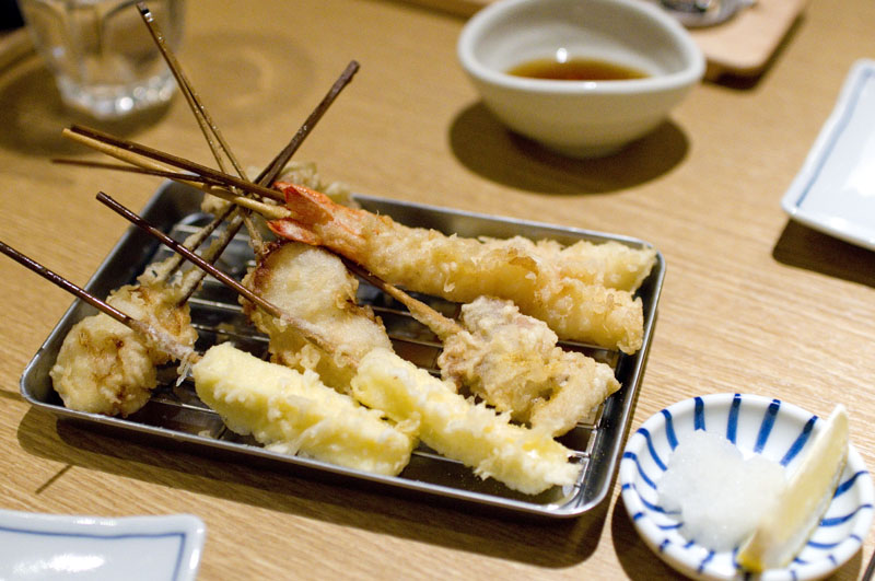 While this is ostensibly a soba shop, most evening visitors are here for the deep-fried kushiage skewers, served with sake, shochu or beer. Skewers come in a nice range of both seafood and vegetable ingredients, and with prices starting at just Y120 they can be hard to resist.