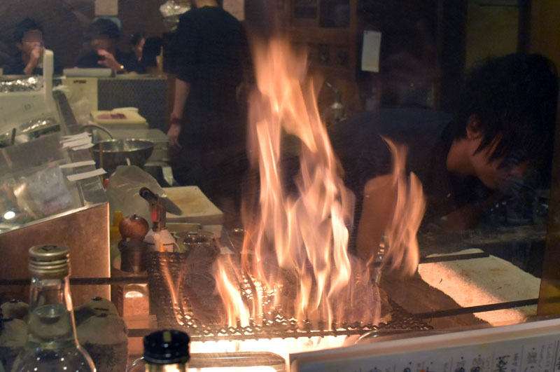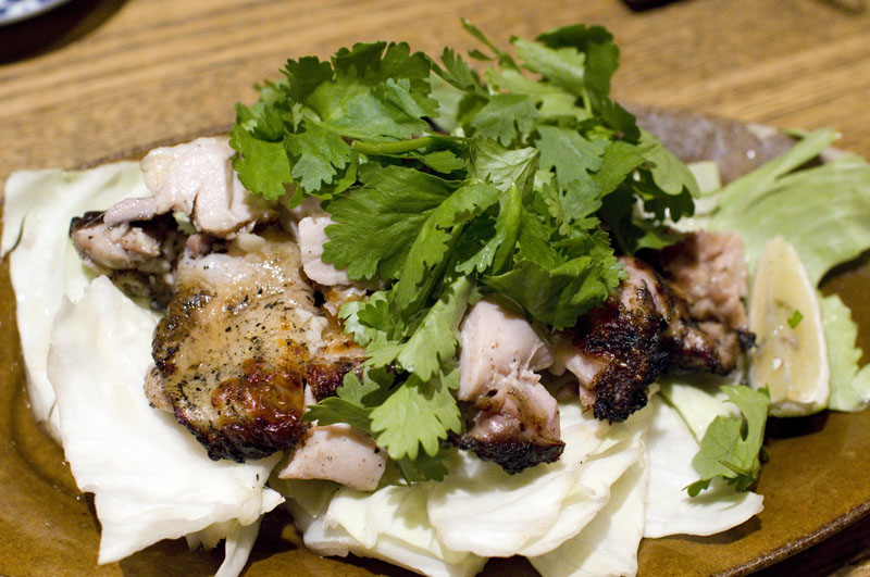 Warayaki, or straw-roasted cooking, is a technique for quickly searing ingredients like chicken and bonito at very high temperatures. It's entertaining to watch, and the straw imparts a pleasant, slightly woody aroma to the food. The warayaki chicken here is beautifully prepared, complemented by garlicky seasoning and served over a bed of vinegared raw cabbage with a hefty helping of cilantro.