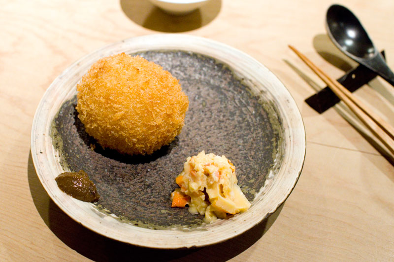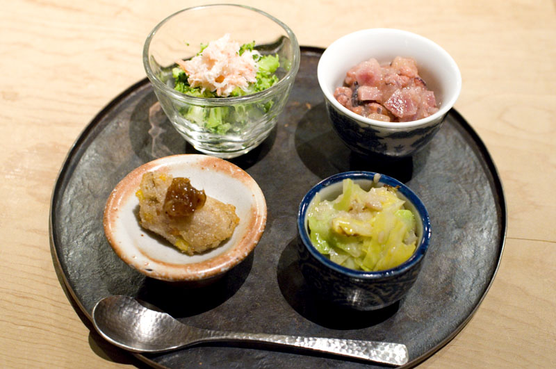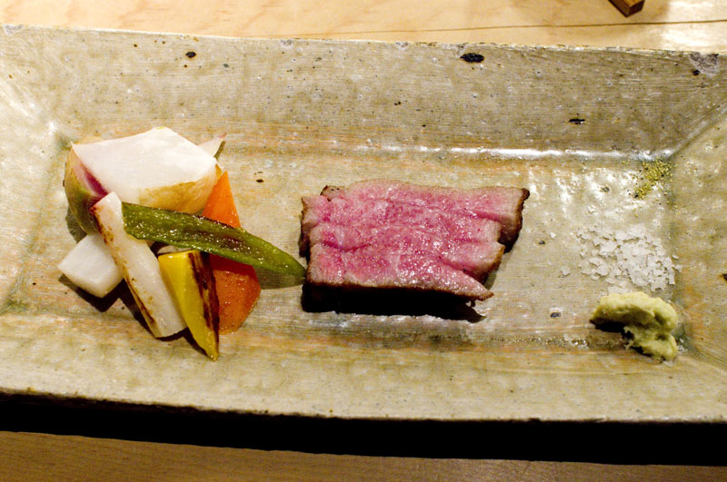Even if you order a la carte, your meal will start off with a tiny cup of soup and an artfully arranged tray of four seasonal appetizers. All the dishes we've tried here have been light and delicate, even deep-fried items like the crabmeat croquettes, which are a specialty of the house. The grilled "olive beef" - wagyu beef from Kagawa Prefecture in Shikoku that's been raised on olives - was richly flavored but not overwhelming, perhaps due to the restrained portion size..