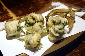Our prix-fixe omakase menu during a recent visit started off with sayori (halfbeak) tempura served with its spine deep-fried until crunchy, followed by a practically greaseless Kyushu-style satsuma-age (deep-fried fishcakes). The sashimi platter wasn't quite so exciting, but the well-prepared dashimaki (grilled omelette) made up for it.