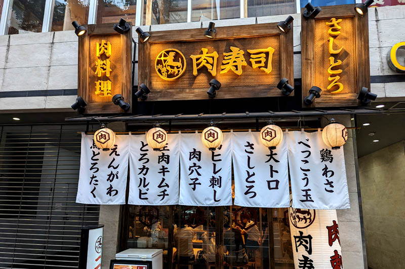 Nikuzushi's signature torisashi platter is particularly recommended - very thinly sliced, fatty cuts of beef short ribs, seared with a blowtorch at your table and seasoned with salt and pepper. English-language menus are available. Budget around Y3500 for food and drink at dinnertime.
