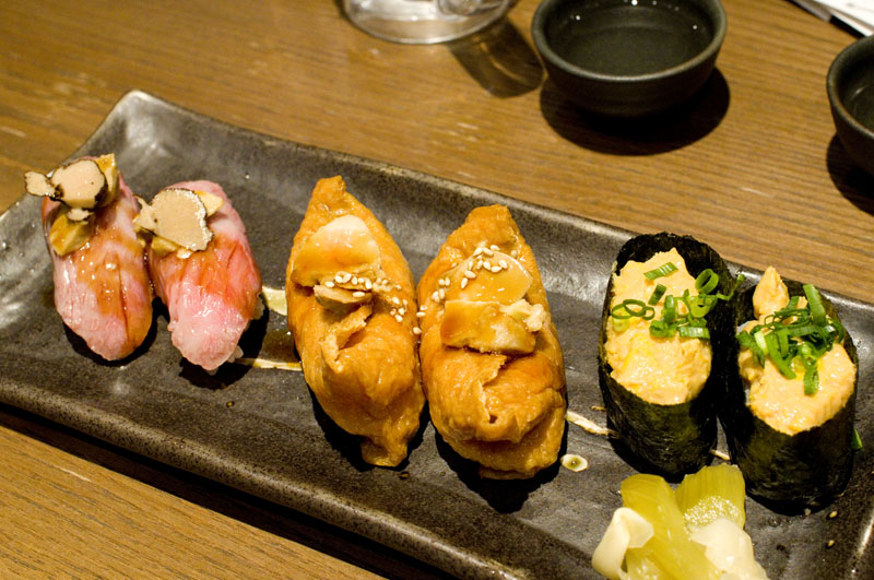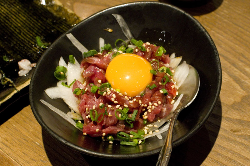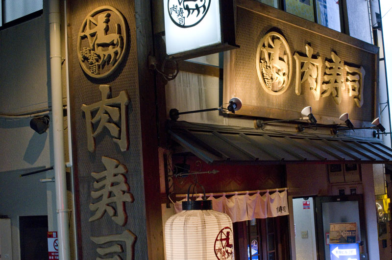 Meat sushi is the unusual specialty of this popular izakaya - sushi rice with toppings like Iberico pork, foie gras, teriyaki chicken, beef tongue, and wagyu sukiyaki. Most of the meat toppings here are cooked, or at least lightly seared, but you can also find sashimi-style raw horsemeat and raw chicken if you're so inclined.