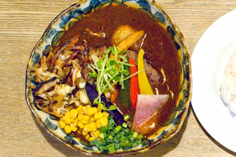 Hokkaido venison burger is one of the unusual soup-curry main ingredients here, and it's a tasty change from the usual chicken. Ponipirika also distinguish themselves from the competition with their soup options - you can choose from the umami-rich wafu-style soup (with katsuobushi and dried mushrooms), a very savory shrimp-based soup, or regular tomato soup. Even the regular version is quite rich though, almost closer to a stew than soup.