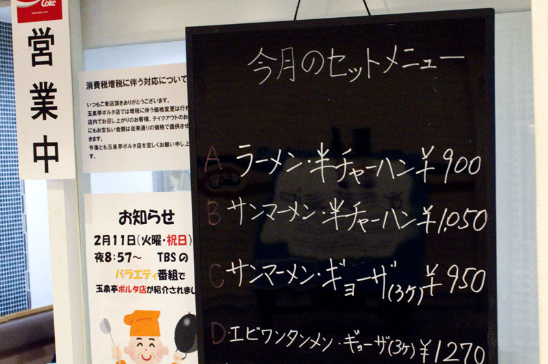 In addition to ramen, Gyokusentei serves a range of inexpensive Japanese-Chinese restaurant standards like fried rice, crabmeat omelets, mabo-dofu, and gyoza and shumai dumplings. A bowl of sanmamen is Y650. Located in Yokohama Porta mall, this is an easy-to-access, non-smoking branch of the shop where it was invented, and if sampling every regional style of ramen in Japan is a goal of yours, then this is a good place to try it out.