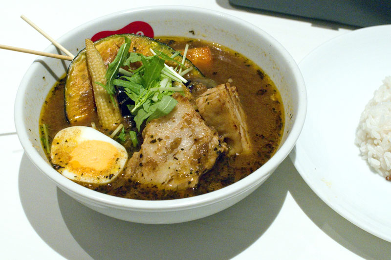 In the hyper-competitive world of soup-curry shops, one thing that sets Suage apart is the high quality of their ingredients. For example, their succulent stewed-pork kakuni is made with "Lavender Pork," an heirloom breed of pig from Furano, Hokkaido, prized for its somewhat sweet, intense flavor. Other curries feature grilled Hokkaido-raised lamb and heirloom-breed Shiretoko chickens from Shiretoko Peninsula in eastern Hokkaido.