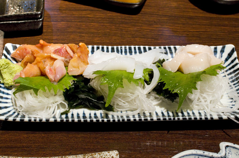 More than thirty types of sake are featured on the monthly specials list, mostly priced at Y600 for a 100ml serving, and the staff are happy to give advice. Service is friendly and competent, and the atmosphere is relaxed, with a soothing jazz soundtrack in the background.