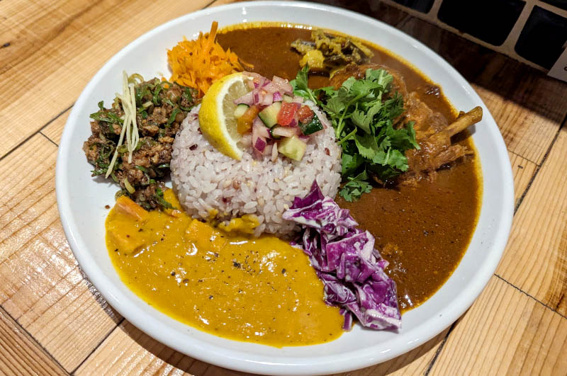 Other options are a spicy chicken leg curry, beef-pork "soup keema", and chicken biryani. In the evenings when the shop is open the menu expands to include original starters like pork belly stir-fried with cumin, and spicy garlic shrimp.