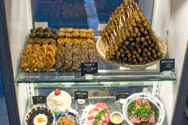 Skewers of Hakata-style grilled chicken skin from Kyushu and Kochi-style gyoza from Shikoku are among the geographically diverse dishes at this regional-cuisine izakaya. They seem to specialize in offbeat drink-friendly fare - other popular items include truffle gyoza, foie gras with horsemeat on bruschetta, horsemeat sashimi platters, spicy noodles and Mentaiko of the Day. The drinks list focuses on shochu cocktails and highballs. Budget around Y2,500 for food and drink.