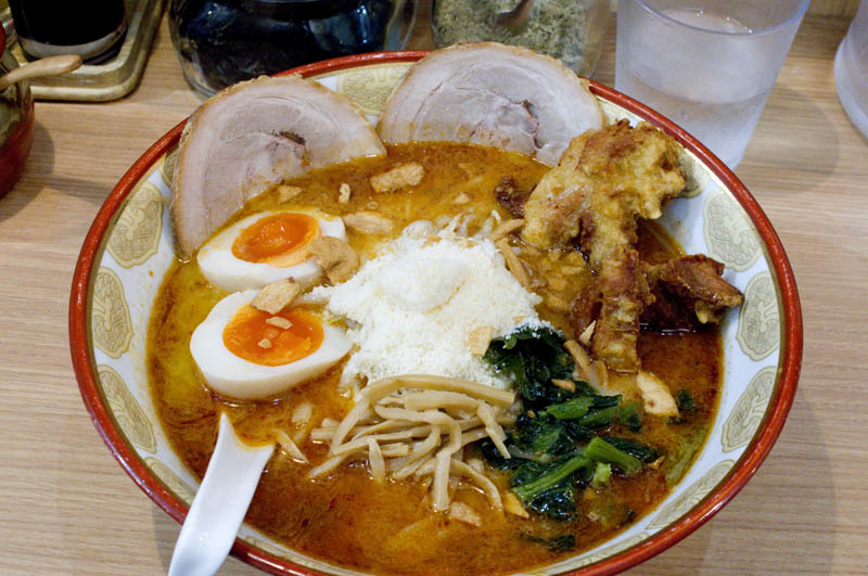 Oreryu's Special "Ga-Ba-Chi" Ramen (aka "Garlic Butter Cheese") is a very satisfying bowl of noodles. It's moderately spicy and heavy on the garlic, with toasted garlic chips supplementing the roast garlic oil in the soup. The two slices of chashu are wonderfully tender and flavorful, while the two hefty pieces of fried chicken somehow retain their crunch despite swimming in the soup. A mound of grated cheese gradually melts and turns gooey as you make your way through the bowl.