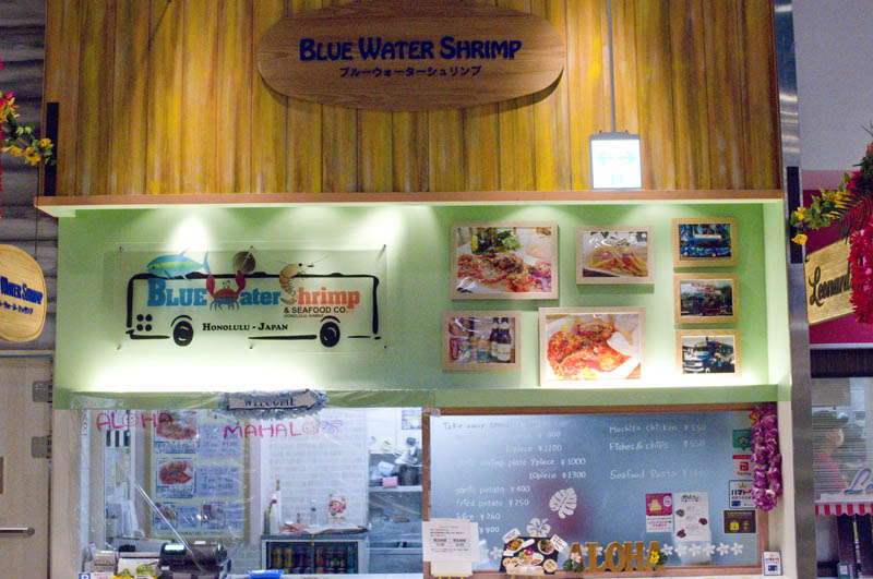 Located inside the Hawaiian Town mini-mall area of the Yokohama World Porters complex, Blue Water serves excellent Hawaiian-style garlic shrimp, to eat here or to take out. Shrimp comes in your choice of mild and spicy versions, in various portion sizes, and with or without rice and salad.