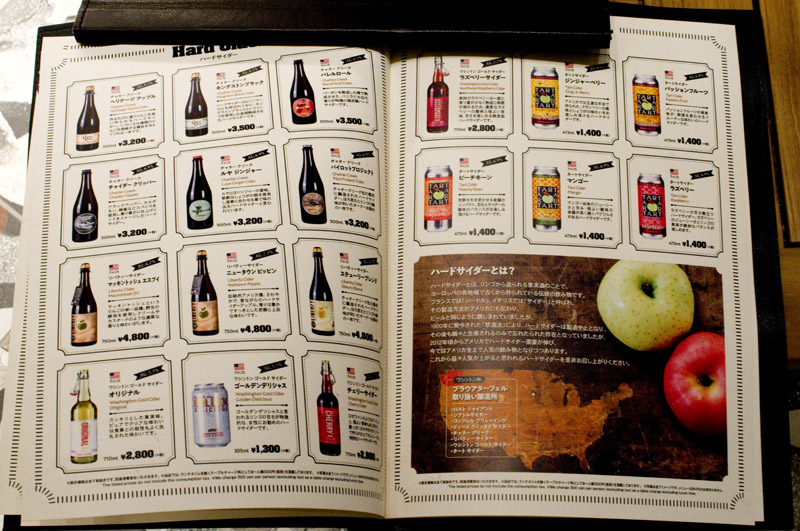 Eight varieties of Seattle Cider are among the most budget-friendly items on the cider list, priced at Y1,200 for a 473ml can, while Raspberry, Mango, Peachy Keen and other fruity brews from Tart Cider are Y1,400 for a similar-sized can. At the upper end of the price scale, 500ml bottles from Chatter Creek run Y3,200 each. Draft cider (from Seattle Cider) is Y900 for a 250ml pour.