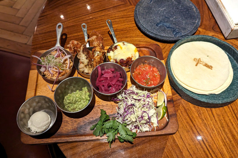 The lunchtime menu, served until 3pm, is mostly familiar dishes - burritos, a taco rice bowl, mixed fajitas - plus one special Mexican dish of the day. The Taco Platter Special is probably the most entertaining of the lunch options. It features soft-shell crab fritters, chipotle chicken stew and chili con carne, plus bowls of guacamole, sour cream and other condiments with which you can assemble your own tacos. Extra tortillas are supplied at no charge.